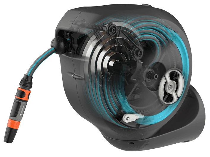 With a light pull at the end of the hose, the integrated steel spring is activated and rewinds the hose automatically and reliably. The RollControl technology ensures slow and safe retraction, no matter how far the hose is unrolled.