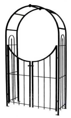 The support rod at the apex of the arch has a floral finial, offering a bit more detailing. For more excitement, the included gate panels curve downward to create a circle when the gate is closed. The steel construction is sturdy and hard-wearing, and the black finish is powder coated for longevity. This finish will give the arbor a distinguished look year after year.